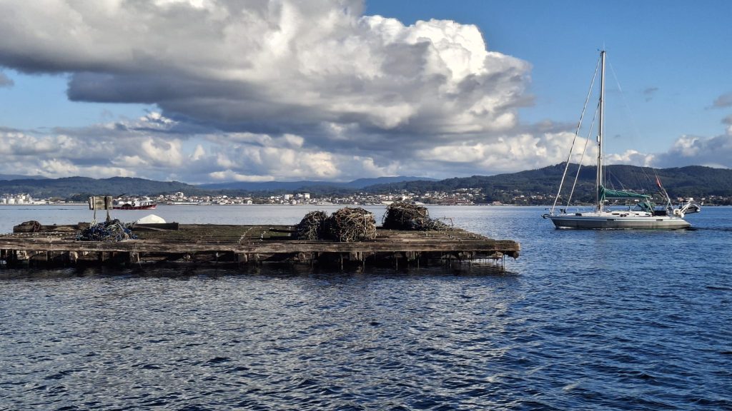In de Ria de Arousa ontwaarden we inderdaad achter de mosselvlotten de Parel met een enthousiaste Bart aan dek. Samen zochten we diep in de baai beschutting in de haven van Rianxo, die een vloot met mosselschepen herbergt. Mosselen worden hier namelijk gekweekt aan lijnen die onder die drijvende vlotten hangen. De halve Ria, oké dat is lichtelijk overdreven, ligt vol met die vlotten. Dat het een gezellig weerzien was, dat hoeft geen betoog.
