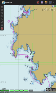 De volgende dag was grijs, zonder wind en vanaf het middaguur regen. Motoren dus en de boot vanonder de buiskap besturen met de afstandsbediening van de stuurautomaat. Saaaai… Maar we ontdekten dat iets wat saai is tegelijk ook spannend kan zijn. We voeren angstvallig strak langs de kust, maar zoals het plaatje laat zien gaat dat maar ten dele. Ook andere boten voeren deze dag niet op open water maar dicht onder de kust. Als het kalf verdronken is….