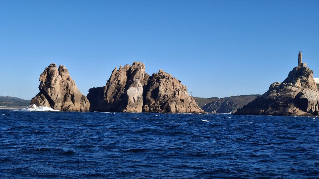 De eerste dag na vertrek uit A Coruña motorden we onder een strakblauwe hemel zonder wind min of meer langs de kust. We verbaasden ons dat talrijke boten mijlen ver van de kant voeren en zich dus niets van de orca-richtlijn aantrokken. ’s Middags om half twee klonk er via de marifoon “Securité, securité, securité” – de standaard-aankondiging van iets wat voor alle schepen van belang is. En jawel hoor, 5 mijl ten zuiden van kaap Fisterra waren twee schepen aangevallen door orca’s. Daar zouden wij de volgende dag in de buurt zijn, maar vandaag bereikten we zonder kleerscheuren de Ria de Camariñas en meerden af in het aardige plaatsje Camariñas zelf.