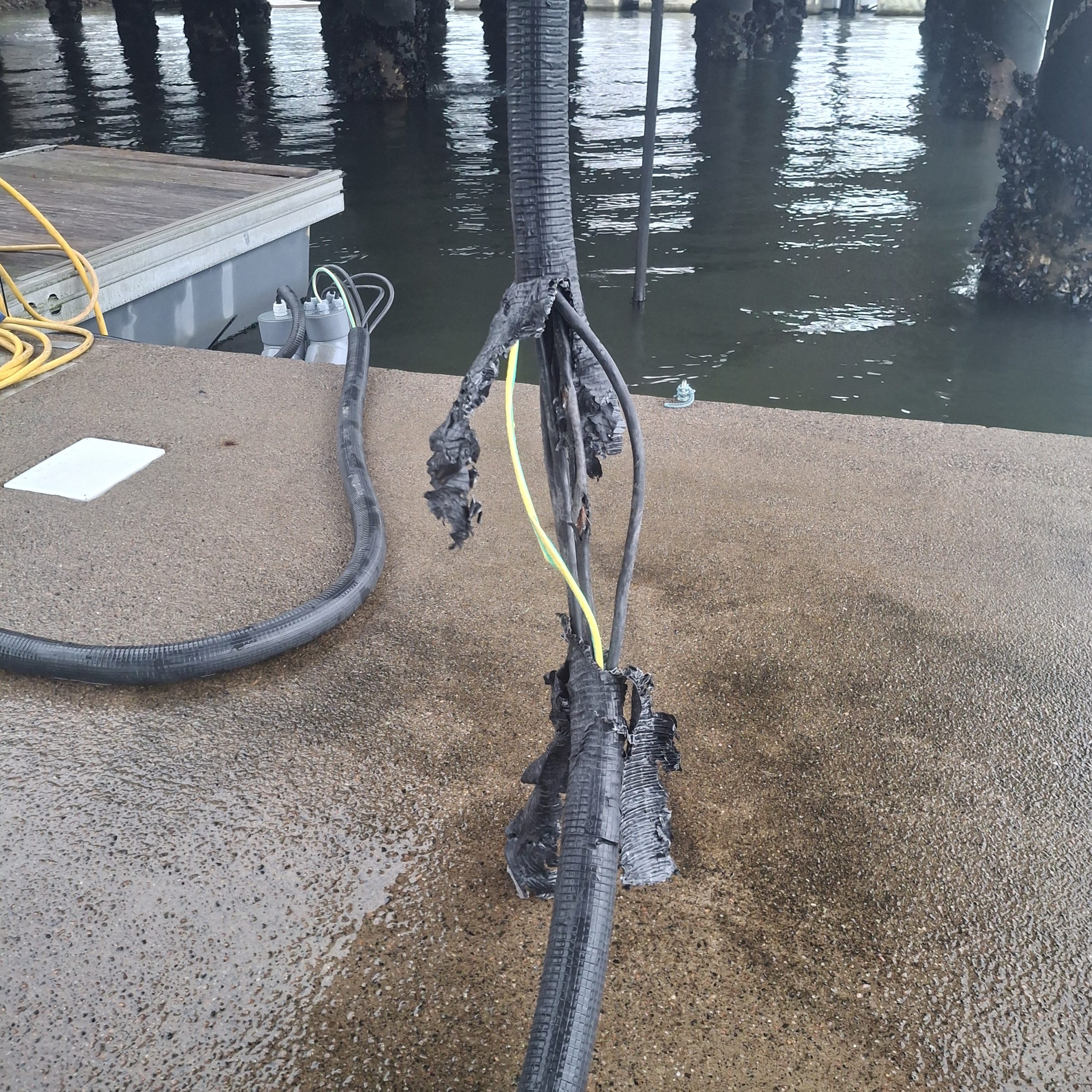 De volgende ochtend was de relatieve rust weergekeerd. Dat ondertussen de stroom was uitgevallen verbaasde ons niet. Het kwam echter niet door het onweer, maar doordat de zware hoofdelektrakabel door de hoge waterstand onder de walsteiger klem was komen te zitten en kapot was geschuurd. Een andere steiger dan de onze was zowaar afgebroken.