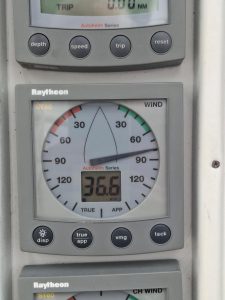 Deining in een haven is niet fijn en harde wind is onrustig. Maar bij een combinatie van beide wordt de boot een kermisattractie qua beweging en geluid. De deining was niet zo hoog, maar lang, waardoor hij de boot meenam tot de lijnen snaarstrak spanden. Je zag de steigers zo’n 20 cm op en neer deinen met de golven van het water. De wind varieerde tussen 25 en 36 knopen (46-67 km/u) en was gemiddeld een windkracht 7 in de haven. Een enkele mast op een naburige boot meende dat hij een orgelpijp was. Mijn vlag begint al flink te rafelen. Dat ik uiteindelijk toch goed heb geslapen geeft wel aan dat ik vertrouwen heb in de boot.